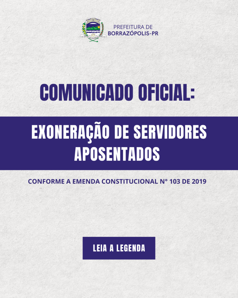 A Prefeitura Municipal, por meio de seu setor jurídico, informa a todos os servidores públicos aposentados a partir de 13 de novembro de 2019, bem como aqueles com idade igual ou superior a 75 anos, que devem comparecer ao setor de Recursos Humanos para solicitar a exoneração de seus cargos.